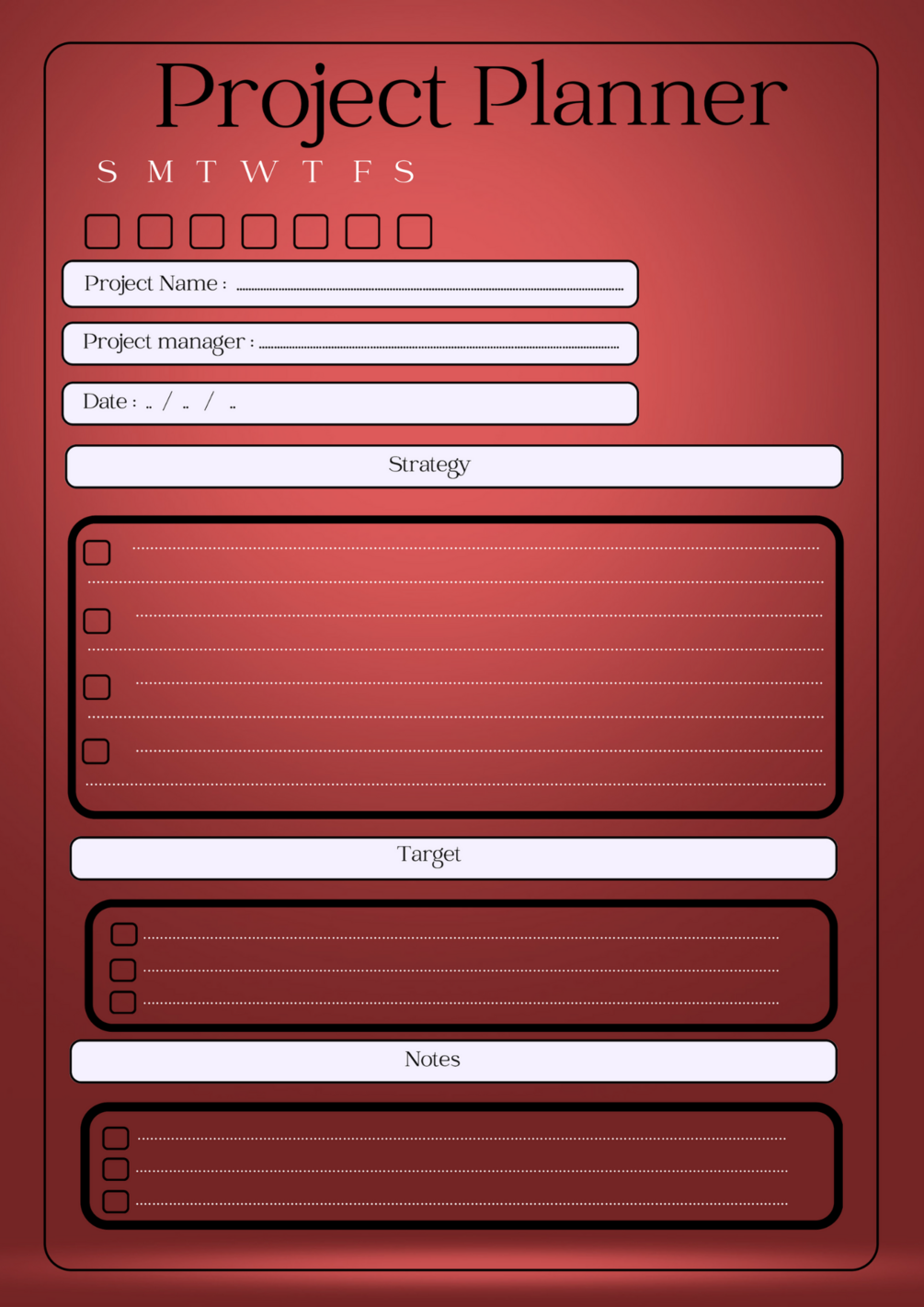 The Project planner document provides an intuitive interface that enables you to easily summarize and manage your project outline effortlessly. To present it to management in an organized and beautiful way, you can visualize the event for your entire project, define the strategy and goals, and take notes about the project.